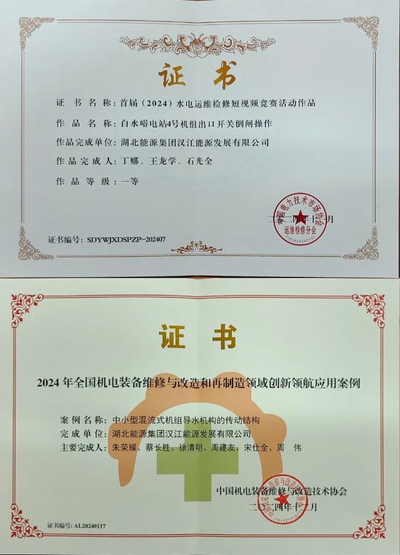 本網(wǎng)訊(丁娜)近日,漢江能源公司制作的《白水峪電站4號機(jī)組出口開關(guān)倒閘操作》短視頻榮獲中國電力技術(shù)市場協(xié)會運(yùn)維檢修分會首屆水電運(yùn)維檢修短視頻競賽一等獎,《中小型水輪發(fā)電機(jī)組的傳動機(jī)構(gòu)》案例被評為2024年全國機(jī)電裝備維修與改造和再制造領(lǐng)域創(chuàng)新領(lǐng)航應(yīng)用案例。